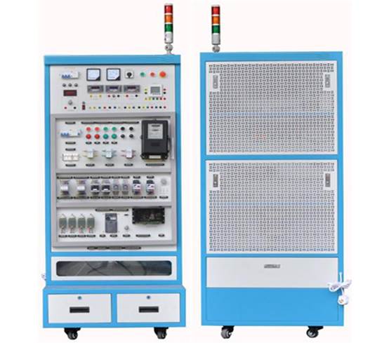 3.1 台架包含实训桌、实训台、电气安装架、考核挂板存放柜等。实验桌有一个带锁抽屉,便于存放实训指导书、实训工具及附件,挂板柜便于存放常用的考核挂板;实训台有时间管理器,可以设定考核时间, 0~250/2A交流可调电源1路,380/2A三相交流电源2路、220V/2A单相电源2路、0~30V/2A直流可调电源1路、实训照明日关灯等。