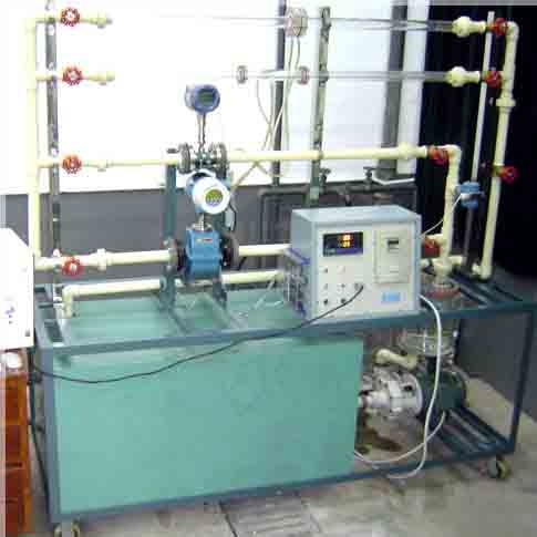 PVC板循环水箱,标定计量水箱,防腐循环水泵,有机玻璃稳压罐,APS循环管路,D40mm、D32mm、D20mm、D15mm不同管径有机玻璃测试管段,涡轮流量计,孔板流量计,文丘里流量计,翼片流量计,差压传感器,调频变频器调节转速,温度由A级Pt100(0.1℃)铂薄膜热电阻测量,8路万能信号输入巡检仪显示温度、流量、差压、转速;本实验台带轮可移动。