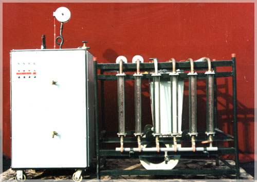 由六组相同直径的紫铜管作为不同形式下传热管道(铜裸管、涂黑管、翅片管、玻璃丝棉保温管、锯末保温管、镀铬管)组成的实验台包括:调节阀门组,蒸汽发生器,热风幕风机,压力控制器及温度保护装置,配电箱等。